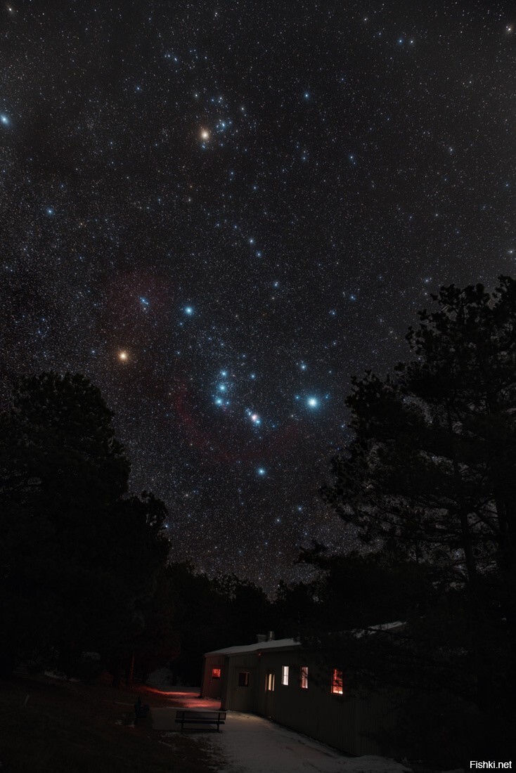 Знакомые звезды созвездия Охотника запечатлены над деревьями на этом красочном ночном пейзаже. Большая туманность Ориона – это не звезда, но ее можно увидеть невооружённым глазом под звездами Пояса Ориона. Фотография показывает слабое розоватое свечение звездных яслей. Бетельгейзе – гигантская звезда в плече Ориона. По цвету она похожа на теплые и уютные земные огни, и такой же цвет у другой знакомой звезды-гиганта – Альдебарана. Альдебаран – α Тельца – находится в вершине имеющей форму буквы V фигуры из звезд скопления Гиады около верхнего края снимка.
