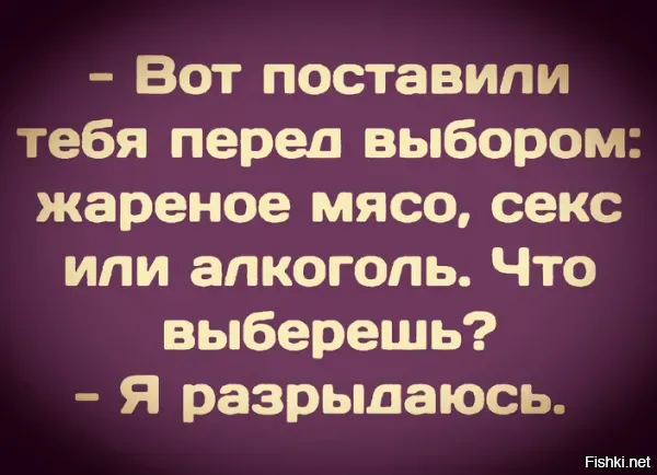 Секс конечно. Мясо я сам могу приготовить, любое, в куче различных форматов. А бухать давно бросил, уже больше 10 лет