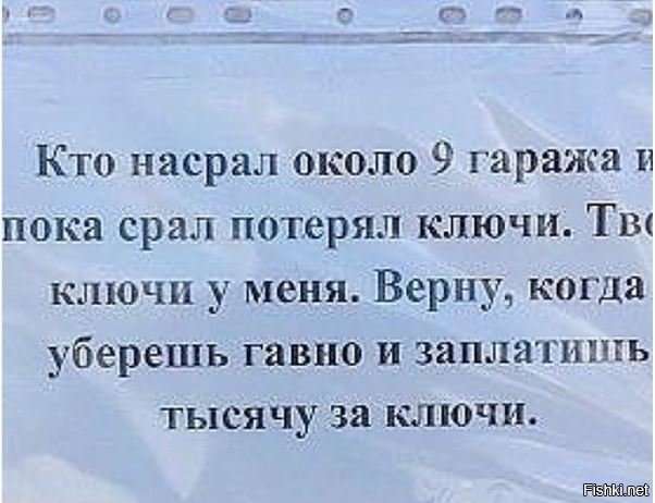 Что-то часто у твоего гаража ключи теряют! Кажется не реже двух раз в неделю! А уж сколько там г@вна, я и представить не могу!