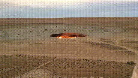 « Ничто, попавшее вовнутрь, уже не может выбраться. Любое живое существо обречено. Попав в загробный мир через эти «двери», никто не может выбраться. Гудящий и пышущий горячим воздухом кратер диаметром 60 и глубиной 20 метров. Газ идёт из-под земли, разделяясь на сотни горящих разновеликих факелов. В некоторых факелах языки пламени достигают 10 15 метров в высоту.»