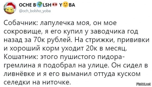 Никогда не понимал все эти принципы покупки "друга меньшего" за бешеное бабло. У нас вся эта собачья\кошачья братия приносится в дом по принципу "Жалко стало, вот и подобрали...". Что тёща, что жена, что дочь... Все по -принципу "Чип и Дейл спешат на помощь". Так и набрали 7 пушистых хвостов всех мастей со всех волостей. И живут мирно.