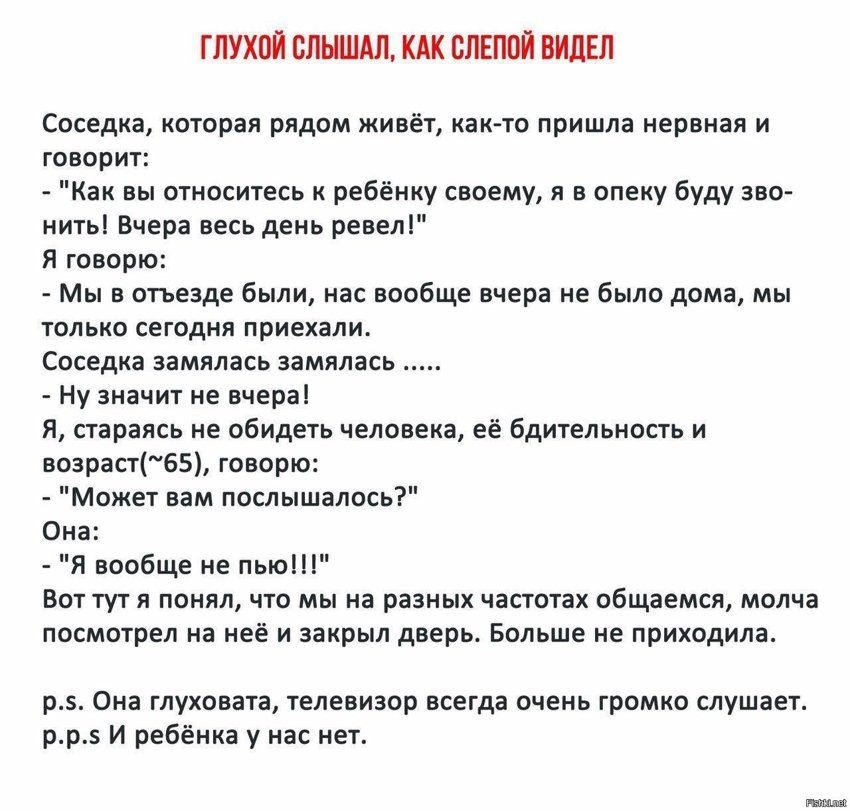 Короче, чтоб не размазывать: соседка живёт сл своим престарелым папаней. И в части потребления горячительных напитков постоянно стараются перещеголять друг друга. Итог: в глыбоком умате оба они вырубились после очередных возлияний. У них работал телик. И папаня, вырубившись, упал на пульт и "прибавил громкости". И телик ревел как буря. Мадам, собственно, от этого рёва и прочухалась. Но не прояснив обстановку, рванула до соседей (т.е. - до нас), потому как ей показалось...