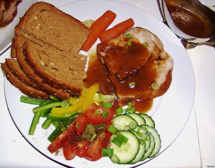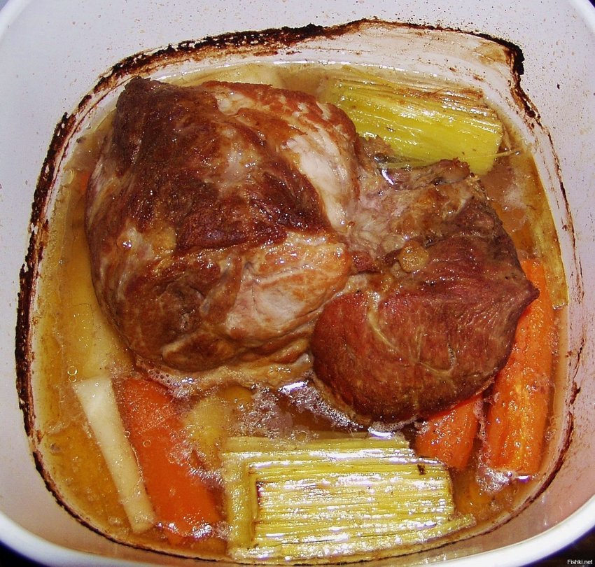 Мясо, запечённое цельным куском в духовке. Думаю, может пост на главную запилить, потому что по немецкому способу мясо всегда получается сочным. С другой стороны, этот способ можно обрисовать в двух словах: со всех сторон на сковородке обжарить, в ёмкость для запекания налить кипятку до середины толщины куска и через половину положенного для запекания времени кусок перевернуть.
