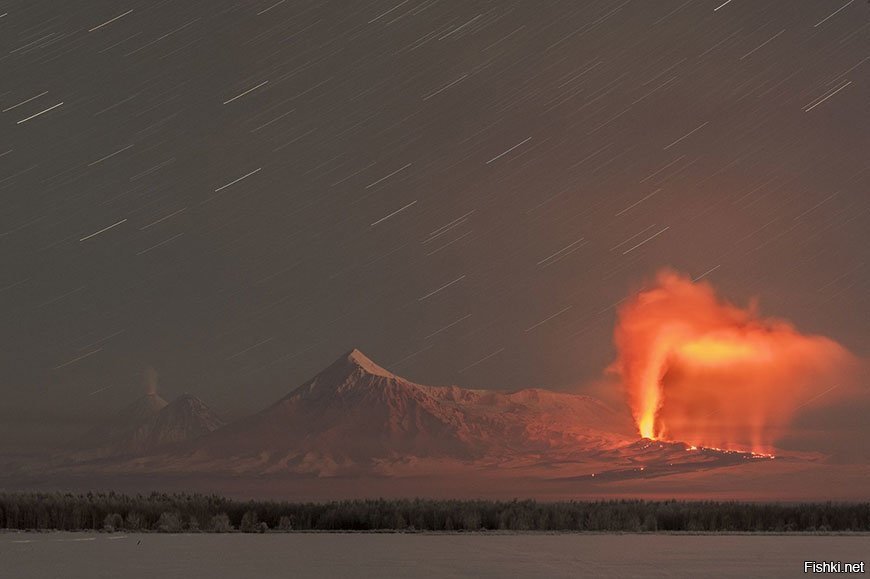 Рождественская ночь на Толбачике. Место съемки: Камчатский край, п. Лазо. Фотосъёмка в экстремальных условиях суровой Камчатской зимы (до -40) длилась от заката, до рассвета. И лишь утром (~7.30) всё сложилось в гармоничную картинку. На переднем плане вулкан Толбачик (3672,4 м). На заднем плане вулканы Камень (4579,6 м) и активная Ключевская сопка (4750 м). Часть природного парка Ключевской. Всемирное наследие ЮНЕСКО.