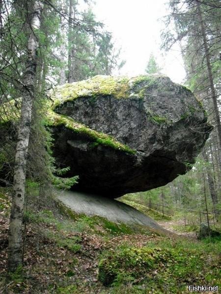 Большой камень как будто балансирует на подставке, окруженной густым лесом.