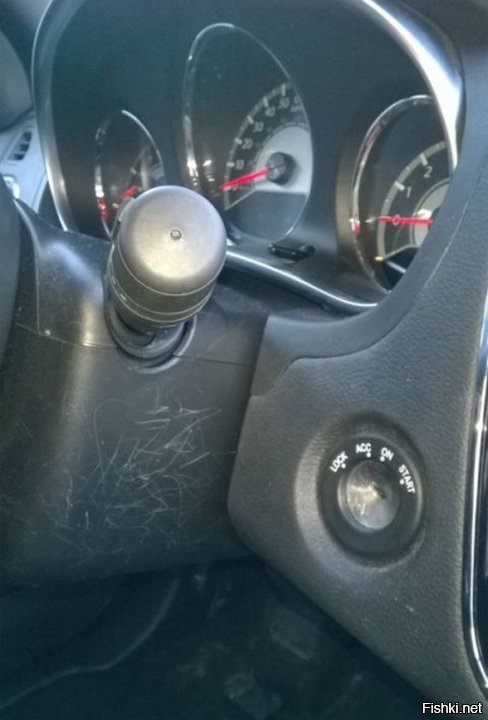 Всё нормально! Просто у автолюбителя тремор рук. Пока в дырочку не попадёт, пластик царапает. Но уж если попал, фиг его от руля оторвёшь.;)