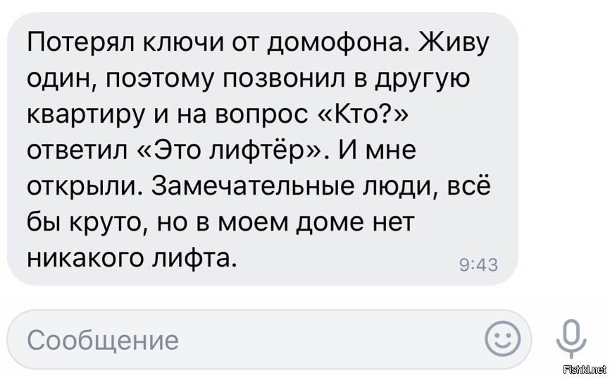 кроме соседей никого и не пускаю. Заходят тут всякие в мой подъезд с фейковых аккаунтов лифтеров и почтальонов, а потом между этажей насрано и бутылки валяются.