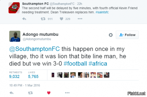 Пару дней назад в твиттере «Саутгемптона» появилась запись о том, что один из судей на их матче упал в обморок. Самый яркий ответ пришел от африканского футболиста Адонго Мутумбу. Перевод: