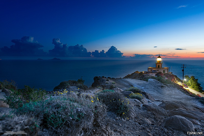 Самая западная точка острова Санторин(Греция) и, практически, самая южная. Судя по количеству посетителей, даже в красивый закат тут можно встретить два-три человека. А небо не только не хуже, даже лучше заката в Ие, к тому же, с видом на кальдеру. Удачно то, что маяк начинает работать минут за 15 до начала заката...