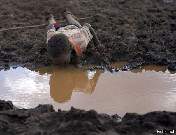 Я НЕ хочу сказать, что в бедных африканских странах, так не может быть. То есть, что дети НЕ пьют из мутных луж. Но ЭТА фотка постановочная. Состояние одежды, обуви, рук ребенка абсолютно не соответствует луже и грязи вокруг. Да и воды ребенок не касается. Кроме того из такой лужи просто УДОБНЕЕ пить "ладошкой", чем ложиться в грязь.
