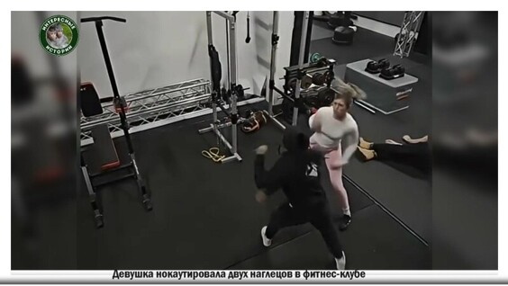 Милая дама не дрогнула и отправила на пол 2-х парней, которые решили потрогать её за мягкое место в фитнес-клубе.