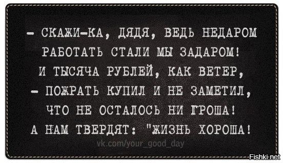 Открываем первый попавшейся новостной сайт: - "Подпись Путина резко повысила акцизы на автомобильное топливо"; "Установлена личность няни, отрезавшей голову ребенку"; "Трагедия «Северной»: о превышении нормы метана знали все"... (заголовки MK.ru). А у Вас на первом анале всё хорошо, платют...?