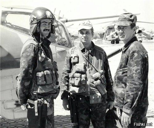 Видите, что висит на бедре у этих вертолетчиков? Нет? Это пластиковая кобура под, ни много ни мало, а целый АКС-74У. Предполагалось, что такое решение в условиях Афганистана окажется куда как полезнее, чем штатный ПМ или даже АПС. Хотя бы, в силу патрона, потому что 9х18 дальше 50 метров вообще не роялит.. Однако, после войсковых испытаний от идеи такой кобуры отказались. С ней совершенно неудобно получалось, так что "ксюху" стали просто класть в кабину, куда не мешает, а на поясе носить более для этого подходящий по габаритам пистолет