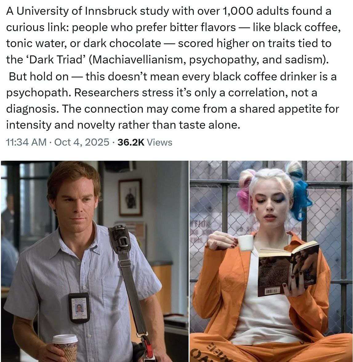 У тех, кто отдает предпочтение горькому вкусу (черный кофе, тоник, темный шоколад ит.д.), яснее угадываются черты характера из так называемой Темной Триады (аморальность, психопатия и садизм). Не то чтобы каждый кофеман обязательно был психом, но корреляция налицо. Возможно это связано с интересом таких людей не столько к самому вкусу, сколько к сильным ощущениям и чувству новизны, которые дарят горечь.