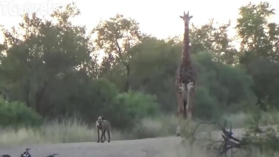 В Африке засняли случайную встречу двух львов, четырёх стервятников, гиены и жирафа, которые не поняли, что им дальше делать