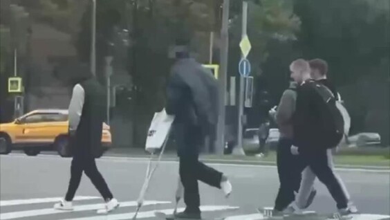 Он пересекал дорогу на скейте, удерживая равновесие с помощью костылей.