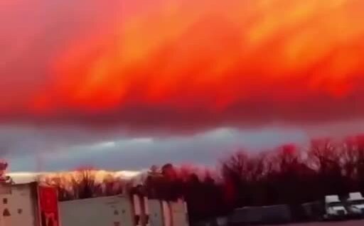 Шельфовые облака, освещенные мощным закатом.