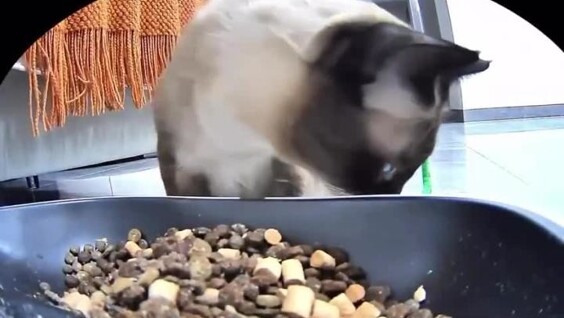 Заботливая кошка приносит свою любимую игрушку к корму, чтобы она тоже покушала