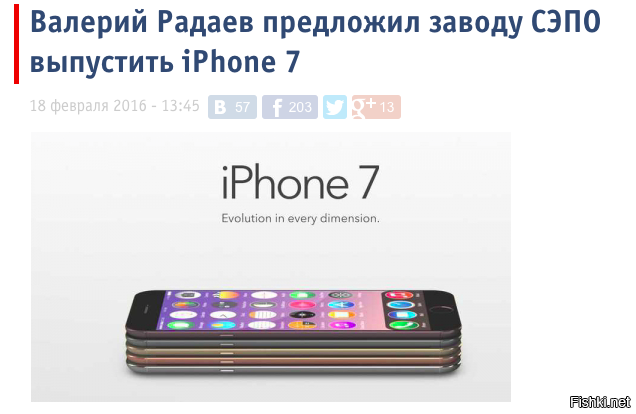 Глава Саратовской области Валерий Радаев предложил руководству завода СЭПО выпустить iPhone 7. Об этом глава региона заявил на заседании актива Саратовской области во время доклада главы предприятия Евгения Резника. В рамках доклада Резник рассказал, что средний срок службы холодильника "Саратов", который выпускает завод, составляет 35 лет, при этом холодильники, выпущенные европейскими брендами служат 7-8 лет. Валерий Радаев похвалил работу предприятия и рассказал о поездке в Африку.