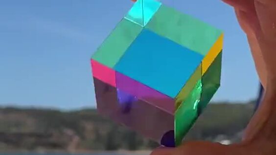 Свет, проходя через куб преломляется и меняет длину волны, что приводит к смене цвета.