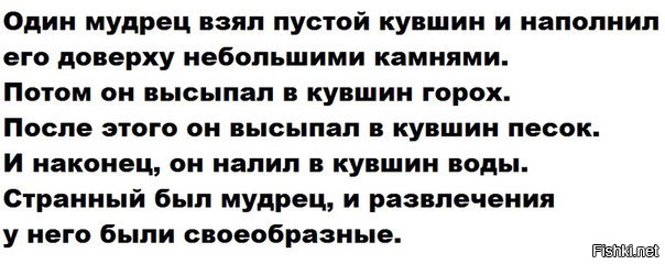 супругам, встречайтесь с друзьями. Всегда будет ещё время, чтобы поработать, заняться уборкой дома, починить и помыть автомобиль. Занимайтесь, прежде всего, камнями, то есть самыми важными вещами в жизни; определите ваши приоритеты: остальное - это только песок. Тогда студентка подняла руку и спросила Профессора, какое значение имеет пиво? Профессор улыбнулся.