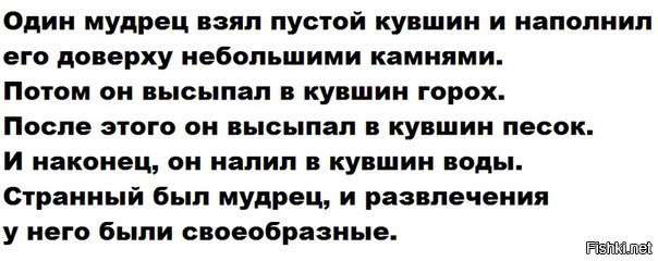 Профессор философии, стоя перед своим классом, взял пятилитровую стеклянную банку и наполнил её камнями, каждый не менее 3-х см в диаметре.