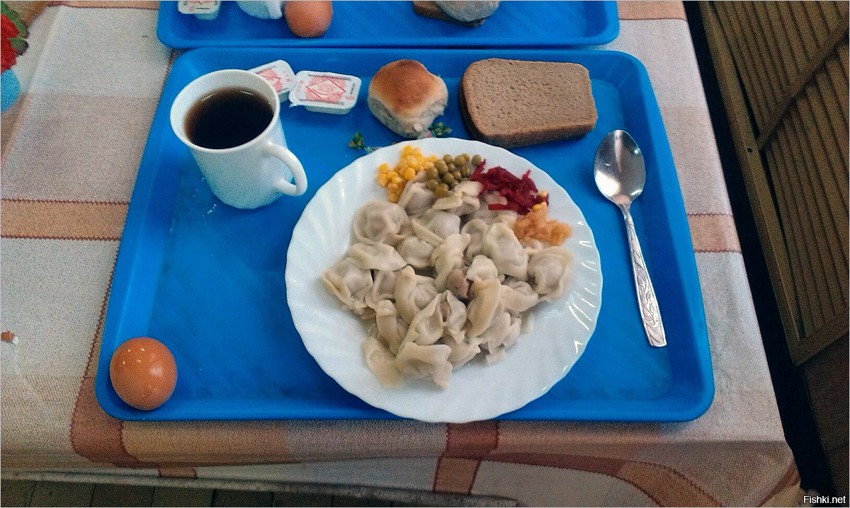 По пятницам в солдатской столовой бойцу СпН предложат на завтрак примерно такое меню: отварное куриное яйцо, порционное коровье масло, хлеб, карамель, чай, булочка к чаю. И пельмени. Пельмени можно сдобрить консервированной сладкой кукурузой, зелёным горошком мозговых сортов, отварной свеклой.