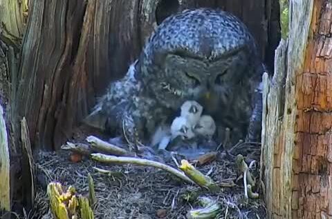 Мама-сова кормит своих детенышей