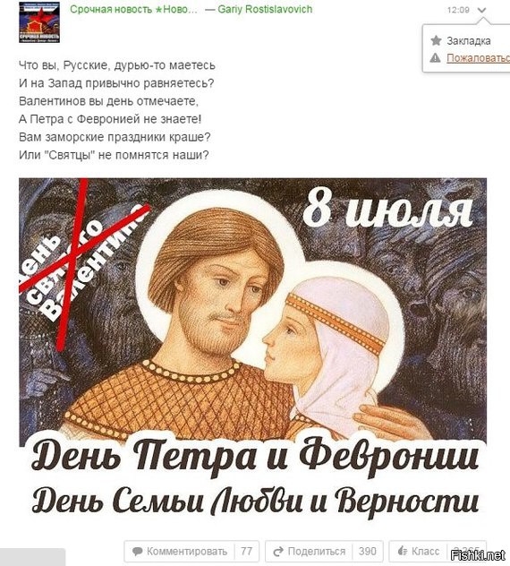 Я уже говорил о Петре и Февронии Муромских и о том, что эти фигуры, эта пара почему-то сделана символом любви, семьи и верности в России. Тут очень сложно говорить серьёзно, потому что, опять-таки, расчёт на дикую серость, на то, что никто никогда не прочтёт, даже хотя бы формально, даже церковного жития. Я уж не говорю о каких-то более основательных источниках.