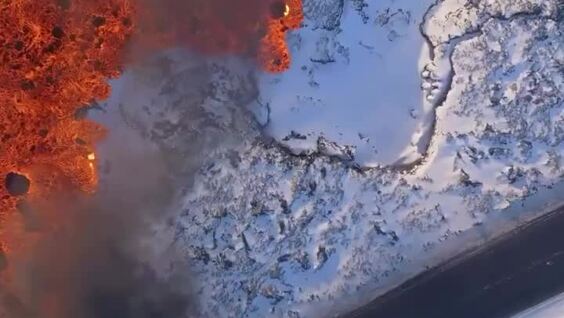 В Исландии с дрона сняли, как лава проснувшегося вулкана покрывает снежные поля.
