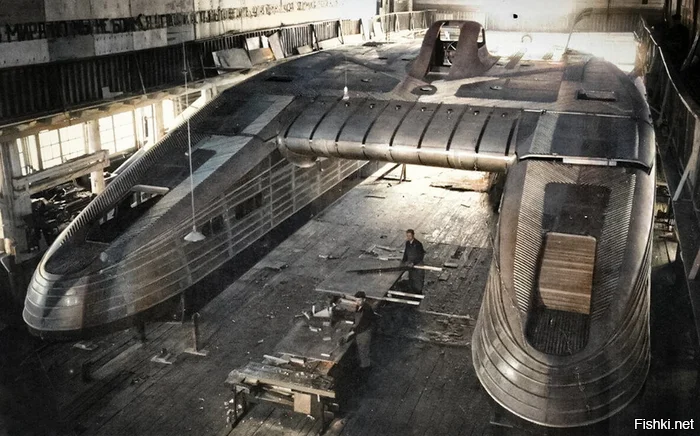 Глиссер-катамаран ОСГА-25 "Экспресс" в судоремонтной мастерской. Сочи, 1940 год.