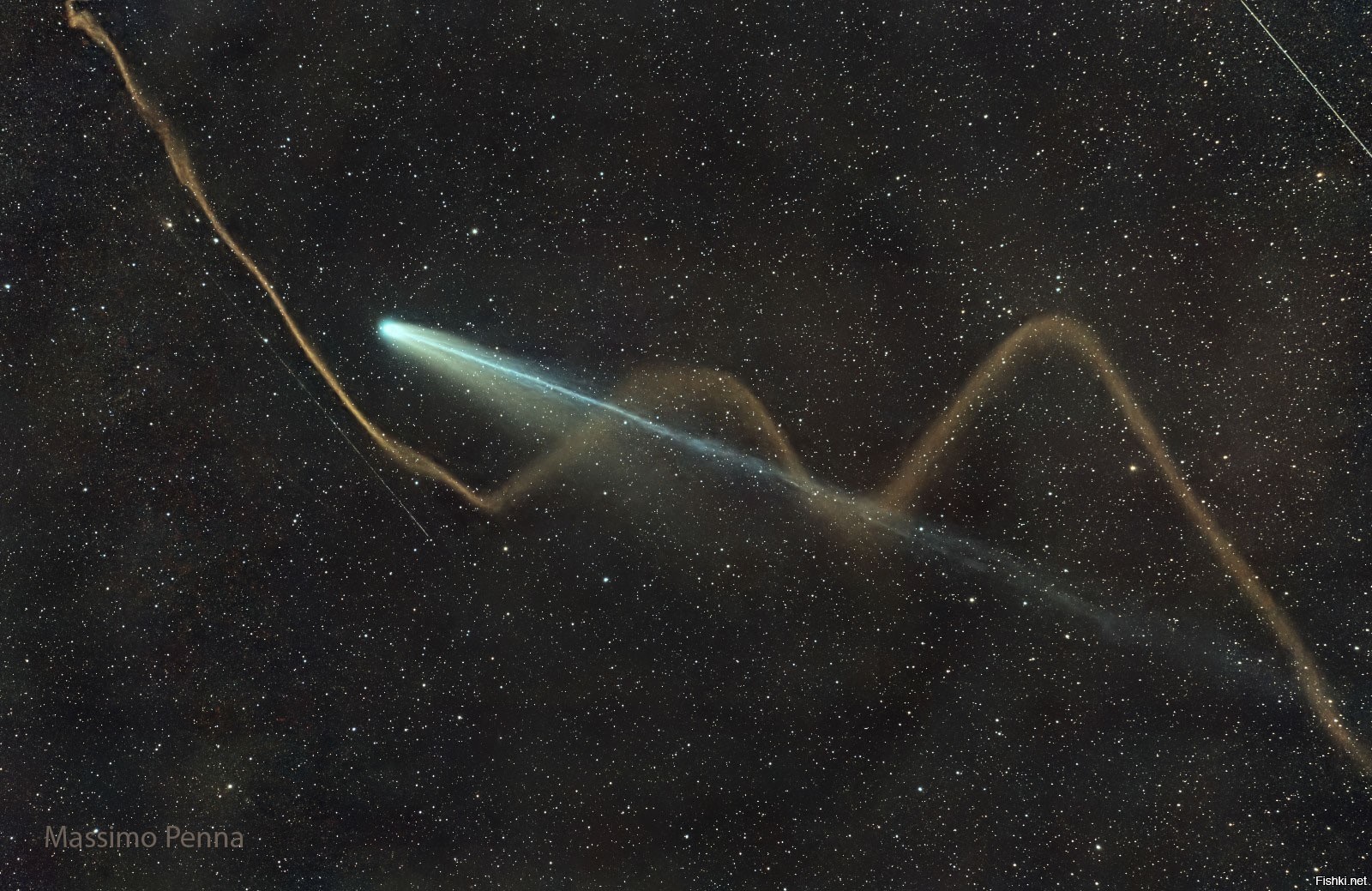 Сколько ярких хвостов у кометы Леммон? Два. На представленном изображении кажется, что их три, но почему? Причина в том, что зигзагообразная коричневая нить — это устойчивый метеорный след, который по счастливой случайности оказался перед далекой кометой C/2025 A6 (Леммон).