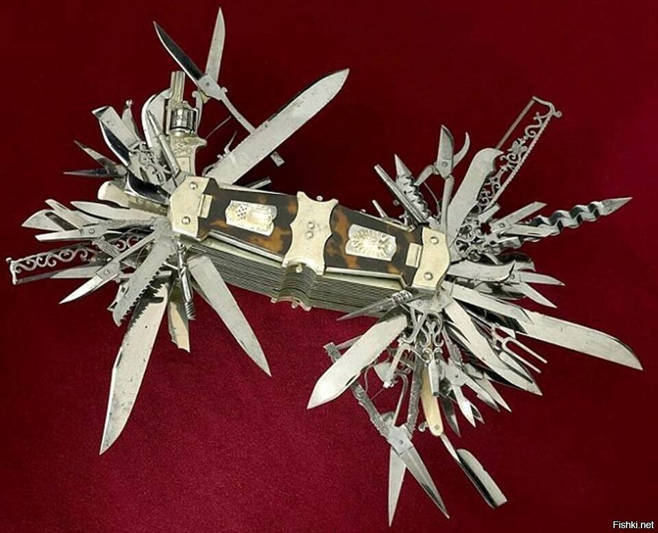 Всем мультитулам мультитул))). Этот самый многофункциональный нож был сделан в Германии в 1880 году фирмой Holler & Co, эта штуковина содержит более сотни всевозможных приспособлений. В их числе пятизарядный револьвер - калибра 2,2 мм, ножницы, штопор, пила, резак для сигар, ручка и карандаш, зеркало, и самое главное - бритва.