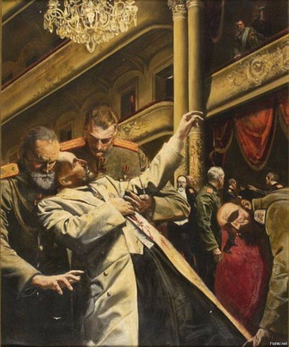 По основной версии, Дмитрий Богров, террорист-одиночка и выходец из богатой еврейской семьи проник в театр в Киеве, где смотрели спектакль Столыпин и Николай II. Во время второго антракта Богров выстрелил дважды: первая пуля попала Столыпину в руку, вторая в печень. Умирая, он сказал: «Счастлив умереть за царя».