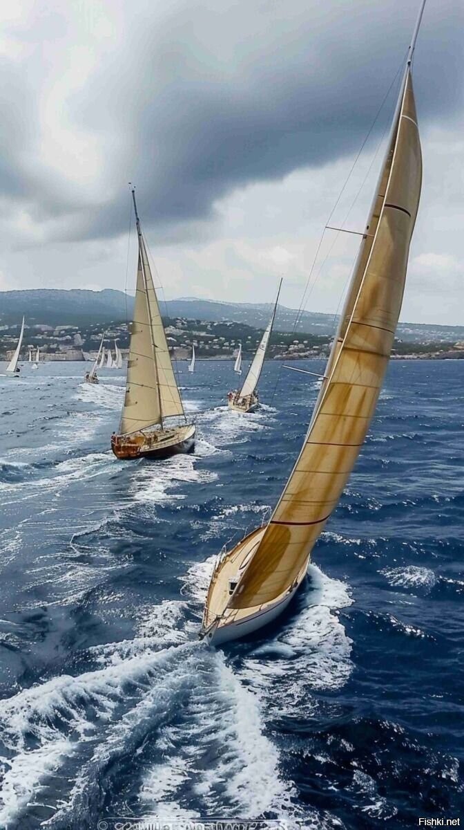 Я обратил внимание, что все суда идут одном курсом и правым галсом, а вторая от художника - левым галсом, причем с наполнением паруса
