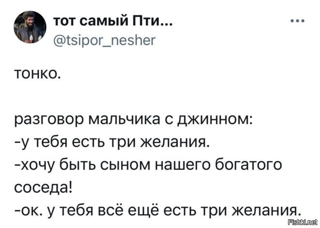 Джин, хочу чтобы тебя осёл отодрал. Это первое. Хочу чтобы ты, осёл, и теща в космос улетели. Это Второе. Хочу, что бы три банки пива тут прям на столе образовались. Это третье. На этом всё. Сделаешь и вали куда хочешь...