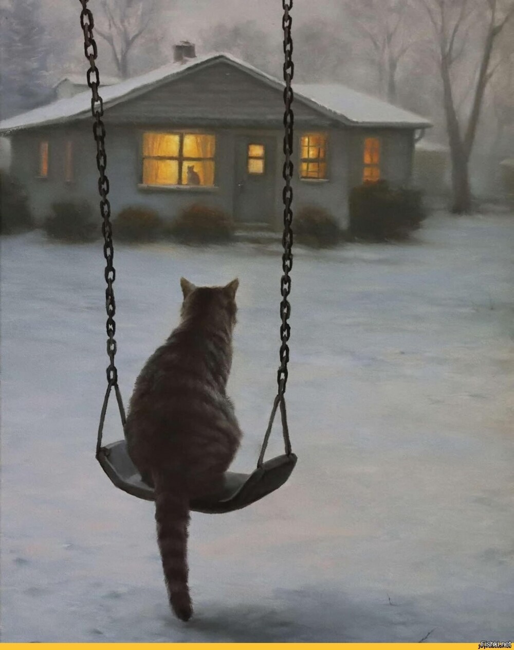 Выхожу на балкон подышать перед сном. Внизу, на детской площадке мужик качает кота на качелях. На мой вопрос "Что вы делаете?", мужик простодушно ответил: "Да вот, вышел покурить, а тут, смотрю, одинокий кот на качелях. Почему бы не порадовать животину?"