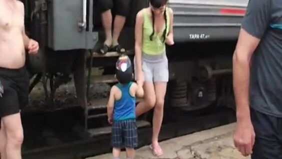 Маленький Юра радушно приветствует прибывших на поезде людей