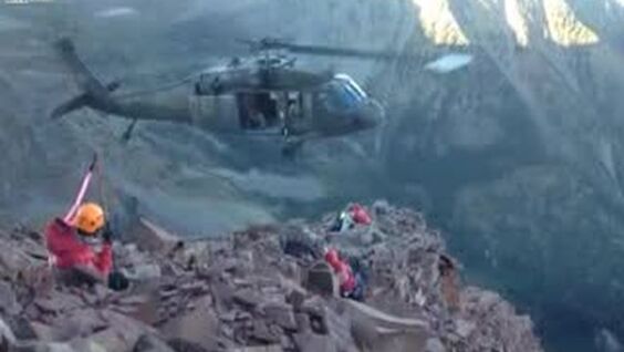 Спасатель из горнолыжного курорта Aspen вместе с работником HAATS национальной гвардии Колорадо эвакуируют альпиниста, сорвавшегося с северного пика Maroon, демонстрируя высший пилотаж на вертолете