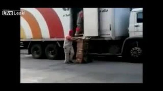 Забавный случай произошел при выгрузке коробок из грузовика - один грузчик не понял намерений своего коллеги и выпал из кузова авто