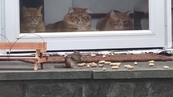 Изобретательный хозяин этих котиков создал для них «телевизор» с живой картинкой, меняющейся в реальном времени. Он рассыпал арахис перед стеклянной дверью, усадил котов на мягкие подушки, и вот на «экране» появился голодный бурундук.