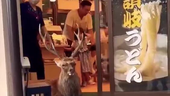 В японском городе Нара, где обитают и спокойно ходят по улицам почти 1,5 тысячи оленей, один из них улегся прямо на входе в ресторан Животное считается священным и прогонять его нельзя, поэтому посетители просто аккуратно перешагивают через оленя.
