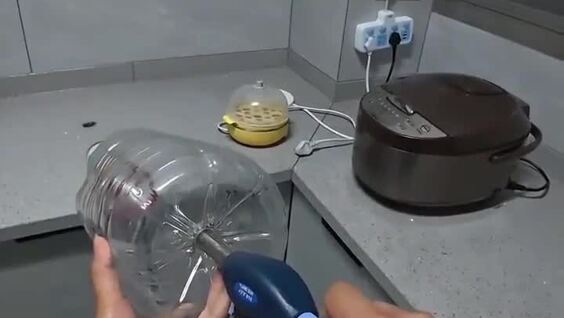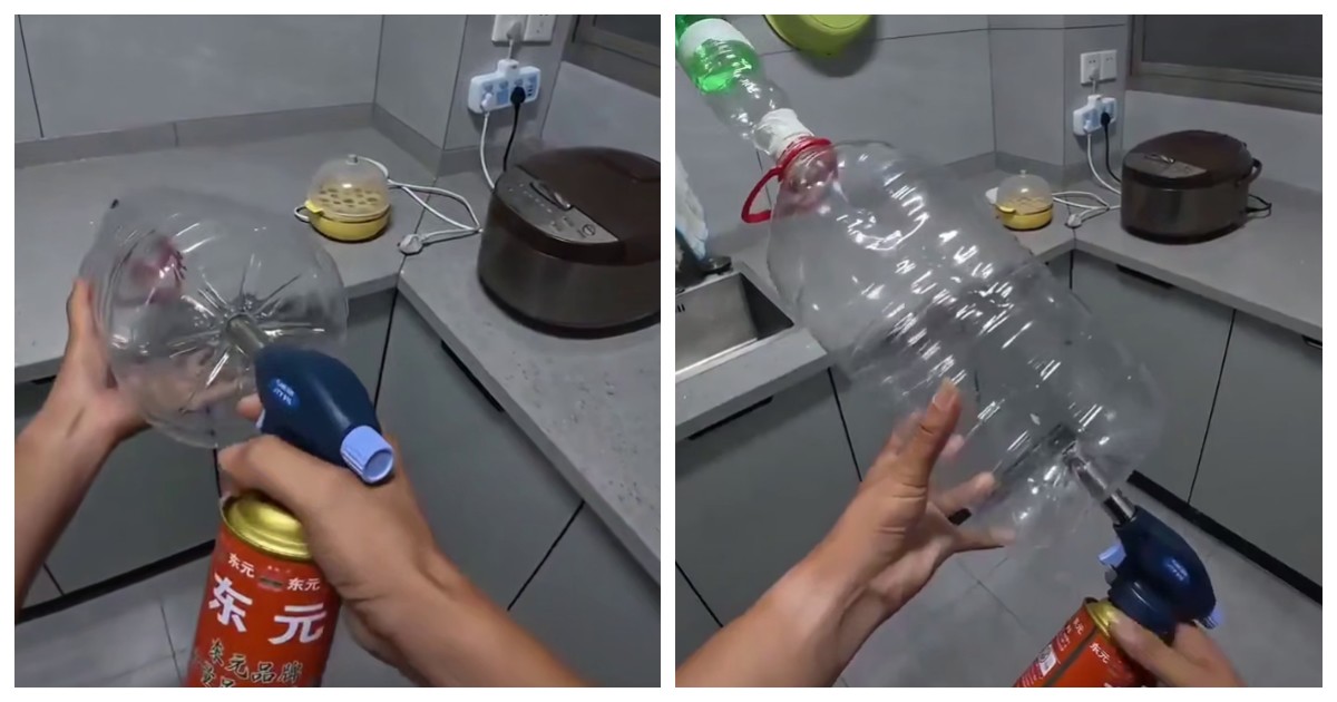 Китайский энтузиаст создал "мини-пушку" для устранения тараканов, мух, комаров и других надоедливых насекомых. Своё оружие он сделал из газовой горелки и частей бутылок.