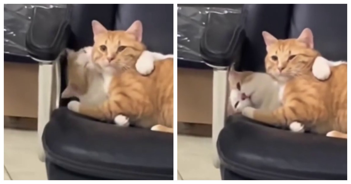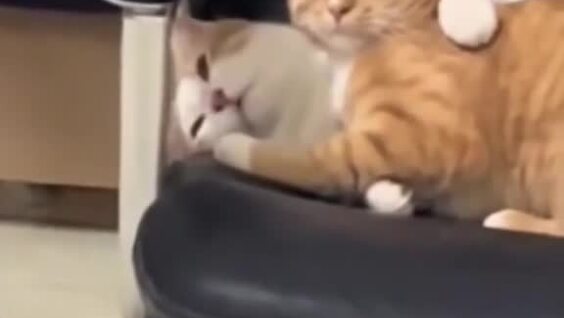 У кошки случился сильный приступ нежности. Она улеглась рядом с котом и начала вылизывать его. Рыжий кот успешно делал вид, что ему не нравится.