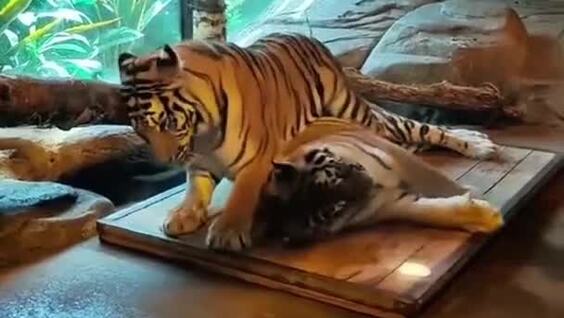 Взаимоотношения животных в дикой природе часто напоминают человеческие. Яркий пример сцена, где один тигр "подвинул" другого с нагретого места.