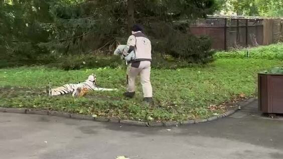 Калининградский зоопарк показал учения по поимке сбежавшего тигра. На опубликованных кадрах человек в костюме тигра бегает по территории зоопарка, после чего его ловят сотрудники.