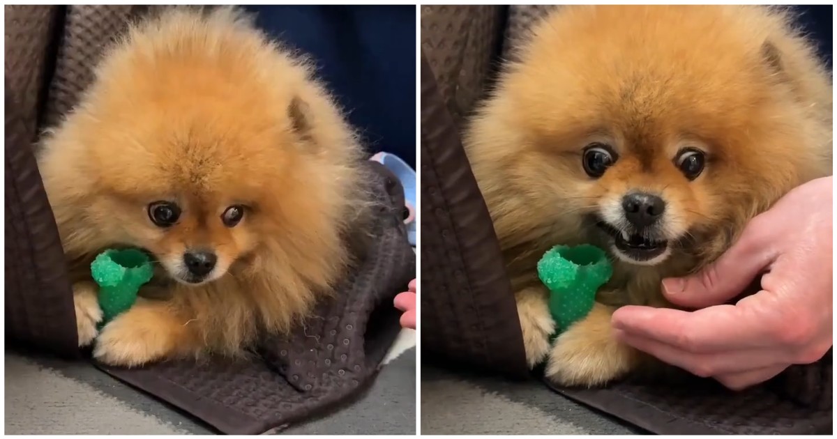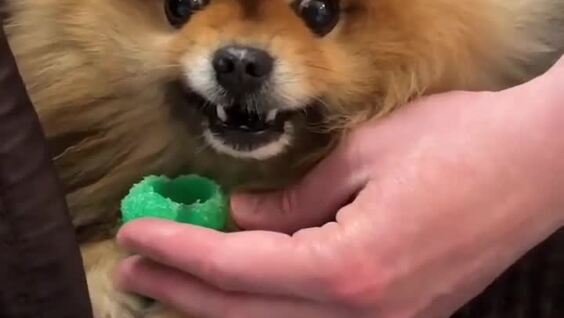 Реакция шпица на то, что мужчина пытается забрать его любимую игрушку. Видео необходимо смотреть со звуком.