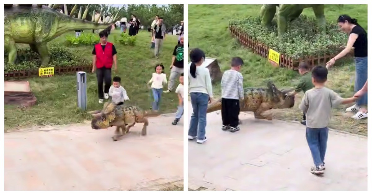 В китайском «Парке Юрского периода» юных посетителей развлекают робопсы в костюмах динозавров. Один из гостей запечатлел робопса-динозавра на видео.