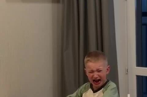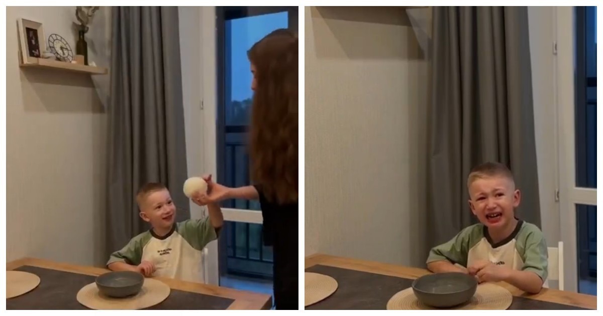 Мама подшутила над сыном, попросив его «помыть» сладкую вату. Ребёнок воспринял слова буквально, растерялся, когда она растворилась в воде, и сильно заплакал.