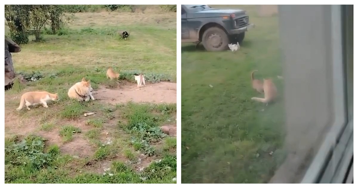 Кот похитил колбасу у ничего не подозревающего пса. Преступник действовал не один.